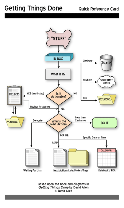 Getting Things Done (GTD) is a personal productivity system developed by David Allen and published in a book of the same name. GTD is described as a time management system. Allen states “there is an inverse relationship between things on your mind and those things getting done”. https://en.wikipedia.org/wiki/Getting_Things_Done