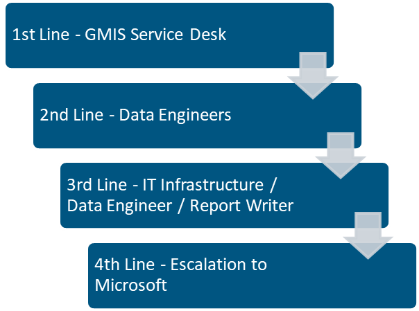 All reports WILL provide a method of raising a Service Desk request for support. Once raised the following escalation routes will be followed.